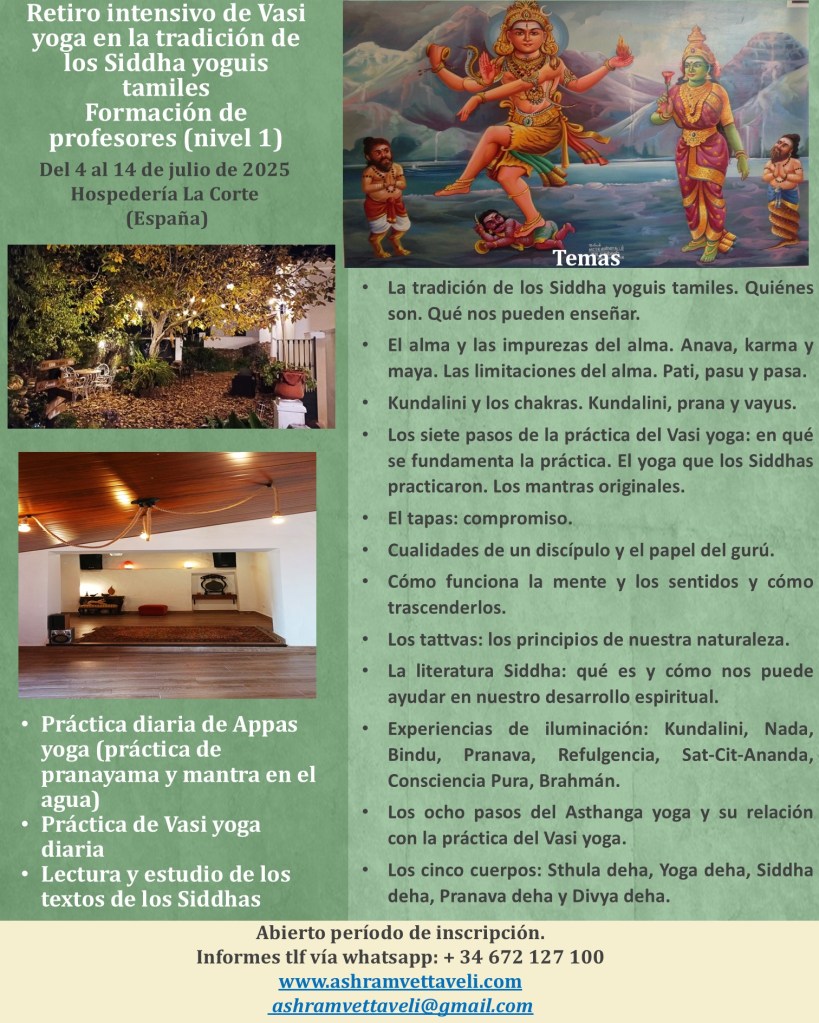 Cumplimos 12 años de retiros intensivos en la Tradición de los Siddha yoguis tamiles. Desde el año 2013 nos reunimos todos los años 10 días. Un espacio donde se une esta práctica milenaria de yoga (tal y como los Siddhas la practicaron) con la base de los textos de los Siddhas, los escritos de estos yoguis (10 libros publicados por nosotros mismos).