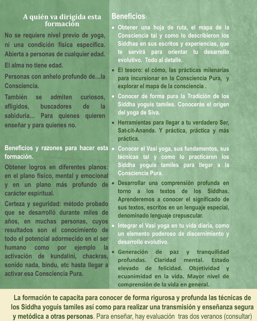 - Conoces el Vasi yoga, sus fundamentos, sus técnicas tal y como lo practicaron los Siddha yoguis tamiles para llegar a la Consciencia Pura.